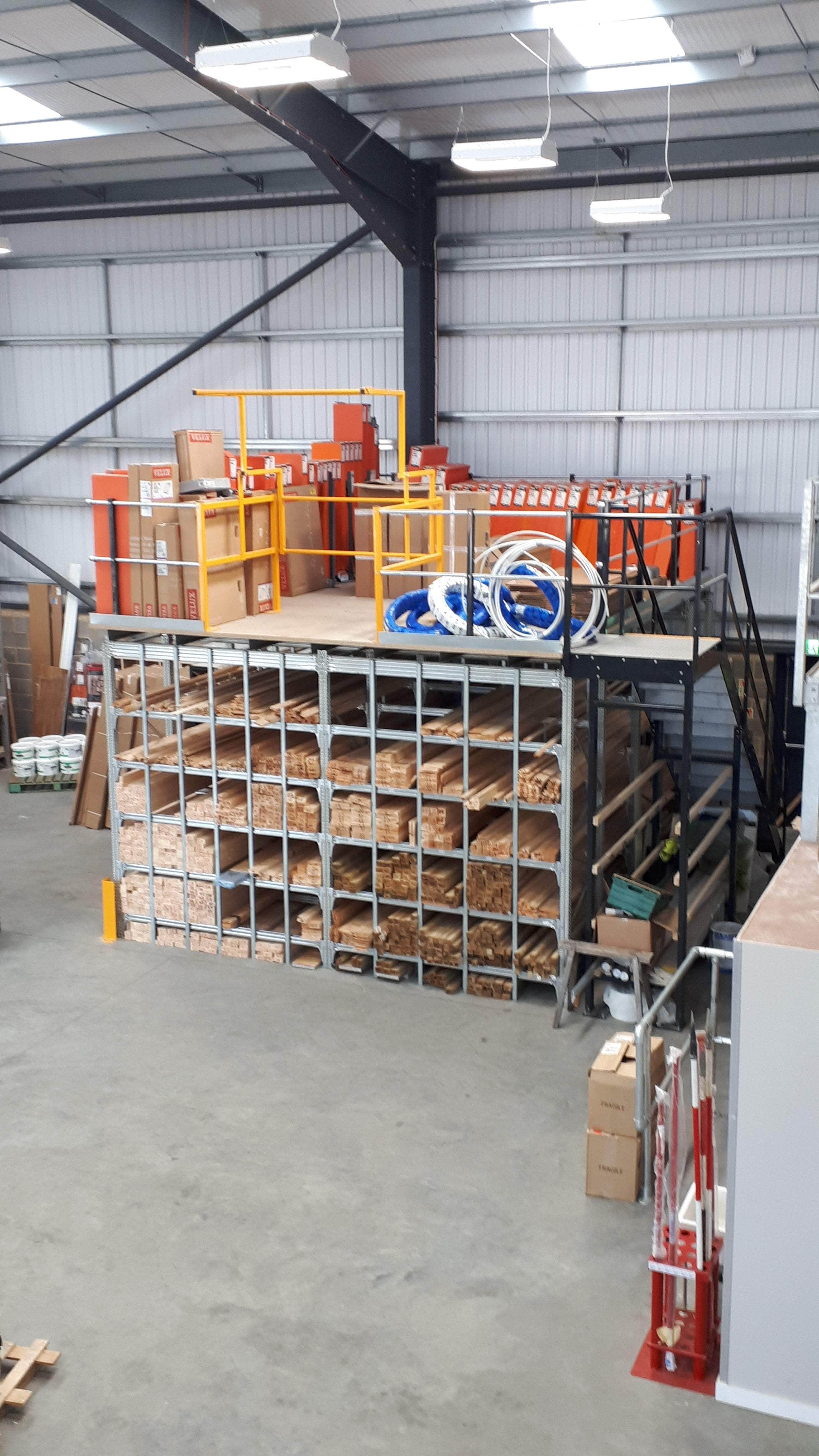 The vertical dividers can be moved once in place to create large or small compartments as the stock rotates and the requirements change. Pigeon hole racks can be boarded out on the top level to create a mezzanine floor storage area with a staircase and handrails for access.